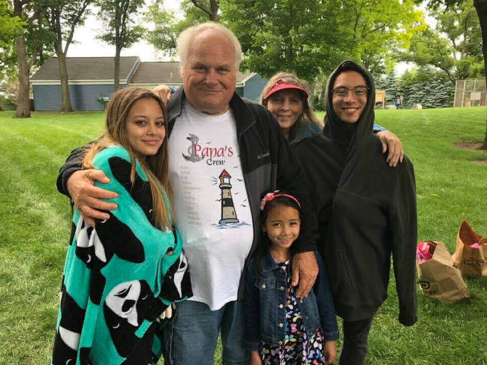 Jim and Carolyn McFadden with Joshua, Alex and Ava on a cold day in June, gathered for an outdoor gender reveal party.